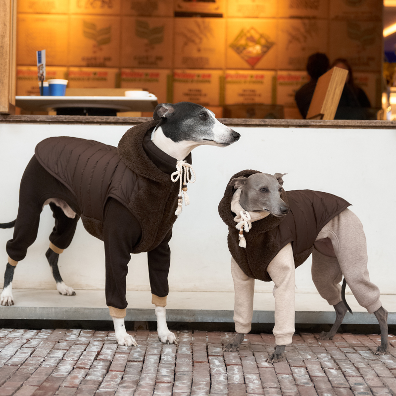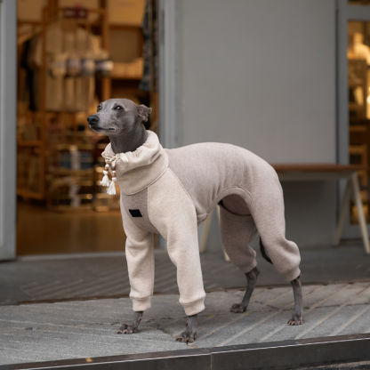 Wrap your pup in chic comfort with the PERLE Fleece Onesie, our latest wool-blend dog onesie designed for style, warmth, and practicality. Inspired by hobo-chic fashion, this cream white and light lavender grey dog outfit blends understated elegance with functional details.