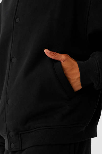 Add a new game-changing layer to your rotation. The Renown Varsity Jacket is made from comfy, heavyweight French terry with drop shoulders, a button front closure, and a smooth look and feel that nails the cool, street-ready vibe. Front slip pockets are handy for storing keys, phone and small essentials on the go.