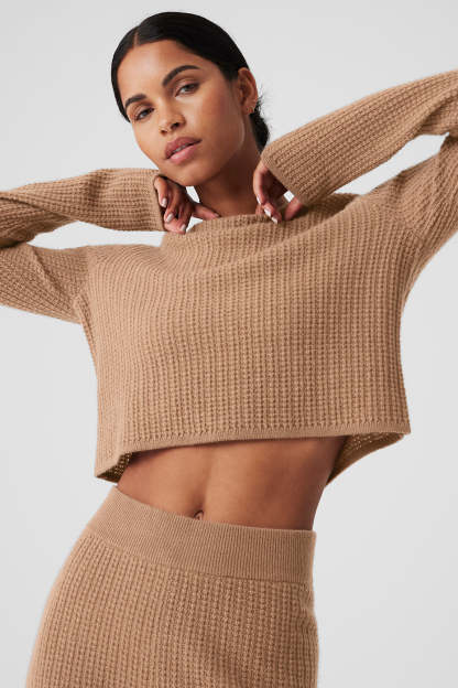 Movie marathons, grocery runs, road trips up the coast# It*s all cozier in this 100 percent cashmere waffle-knit top. Fitwise, it has long (scrunchable) sleeves, a wide neck, an easy fit and a cropped length that hits at the natural waist. Pair it with the matching pants or your go-to trousers, skirts, and shorts.