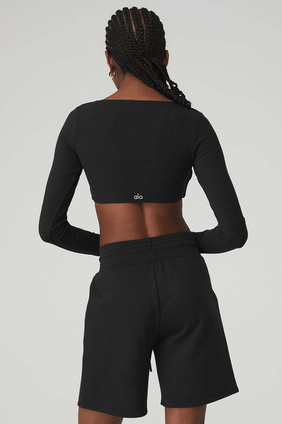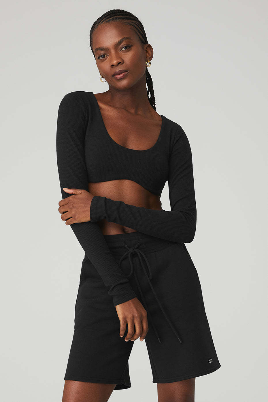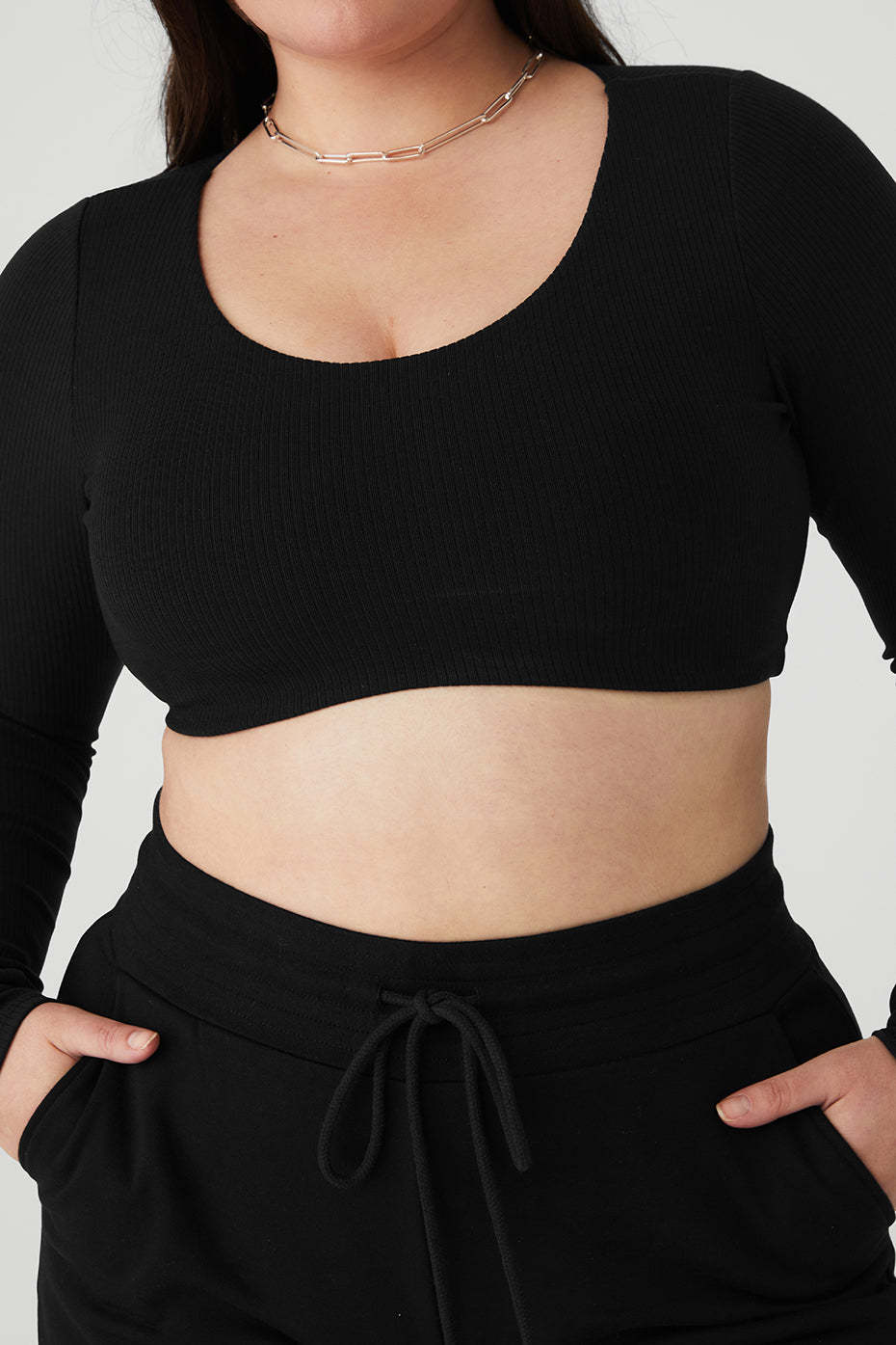OM-M-G this. Too-cute Ribbed Defined Long Sleeve Bra is it. A tiny cropped bra top, with removable cups and a scoop neck〞all in comfy Wellness ribbed fabric. We*ll be wearing it with flared leggings.