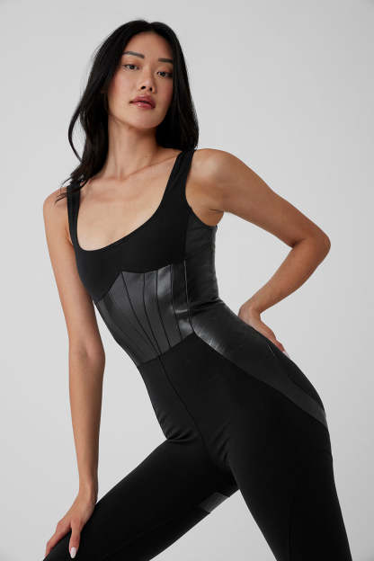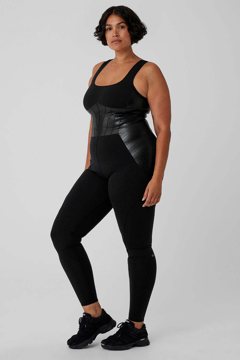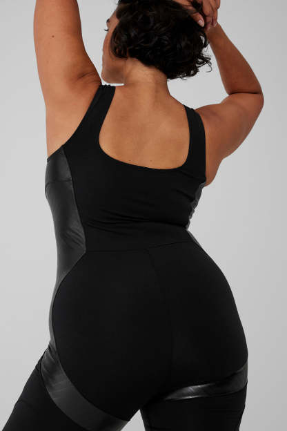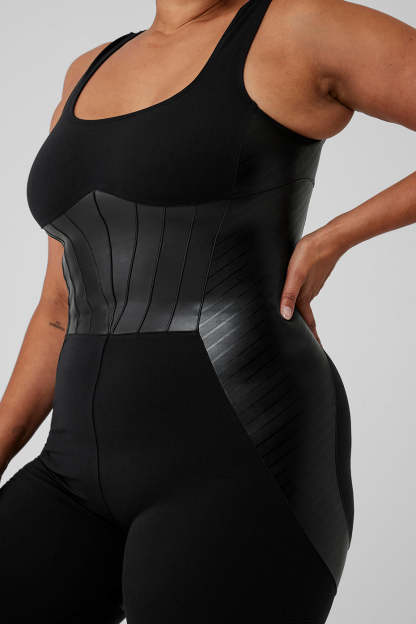 FIERCE. This sleek catsuit features faux-leather paneling at the bodice, sides and bottom. Made from our signature Airbrush fabric, it*s cottony-soft with medium compression for a flattering, smoothing fit. Tank straps and seamed, full-length legs keep the design streamlined, so you can wear it to workout (with sneakers) or to step out (with heels, jewelry and a blazer).