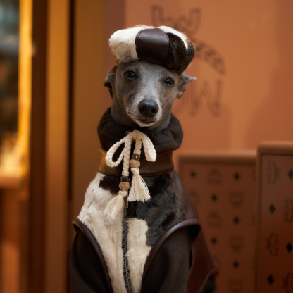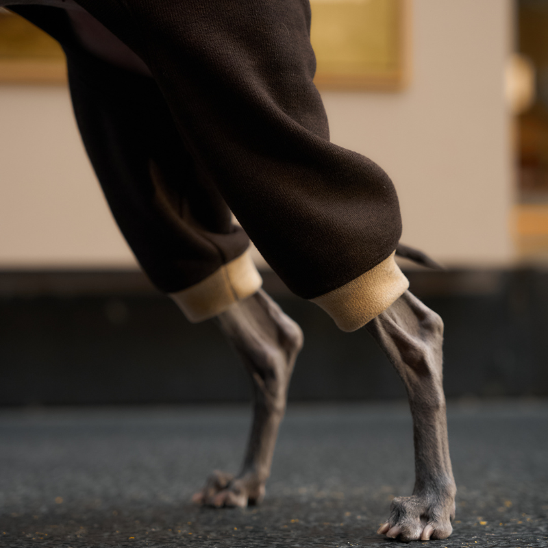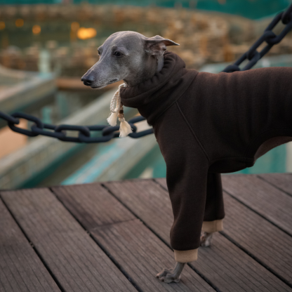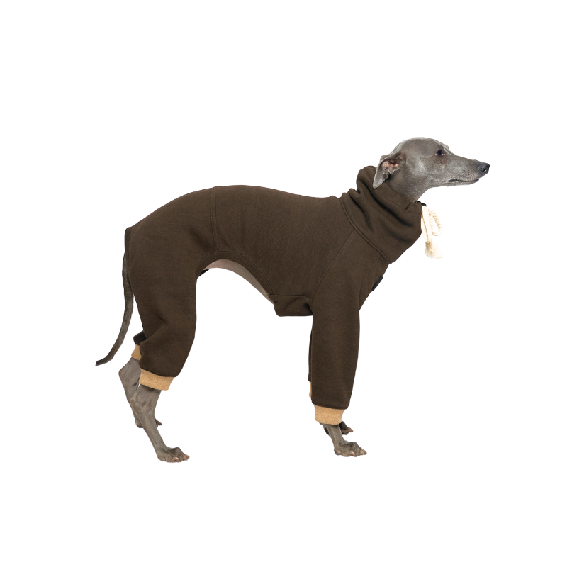 Introducing the SERGE Fleece Onesie—a statement in cozy sophistication for your four-legged companion. Crafted in a decadent dark chocolate brown wool blend and accented with creamy contrast cuffs, this piece redefines luxury loungewear for dogs. Inspired by easygoing “hobo” fashion and tailored for the modern pup, the Serge Onesie effortlessly blends high design with everyday practicality. This thoughtfully designed dog onesie features a signature braided string threaded with a delicate bead, allowing you to adjust the collar for just the right fit—tightly cinched for extra warmth or worn open for a laid-back look.